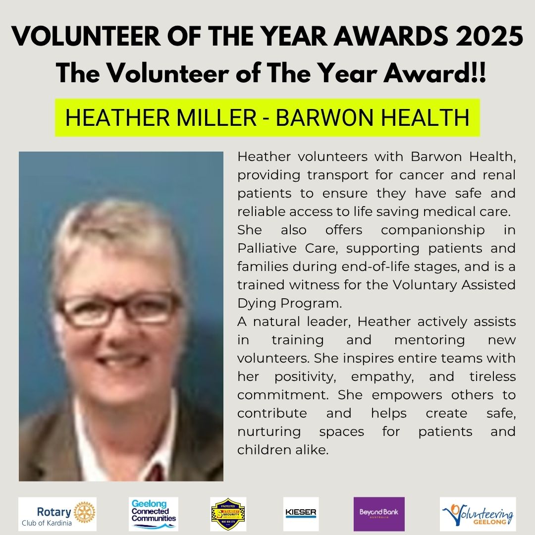 - The Volunteer of the Year Award – Heather Miller, Barwon Health